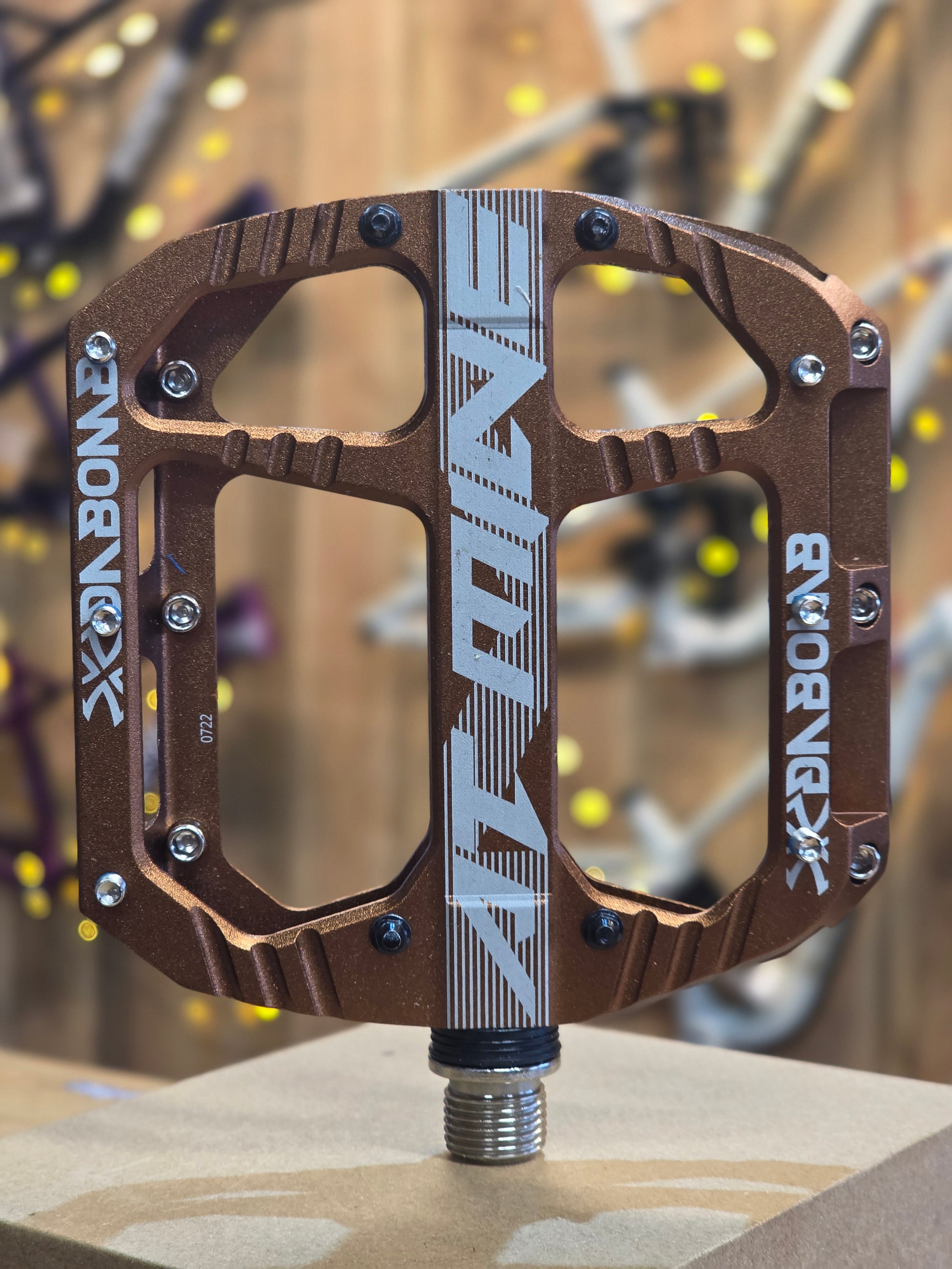 The AT MINE is a high-end pedal set built with a CNC Cr-Mo steel axle, two sealed bearings, and DU bushings, ensuring outstanding durability.