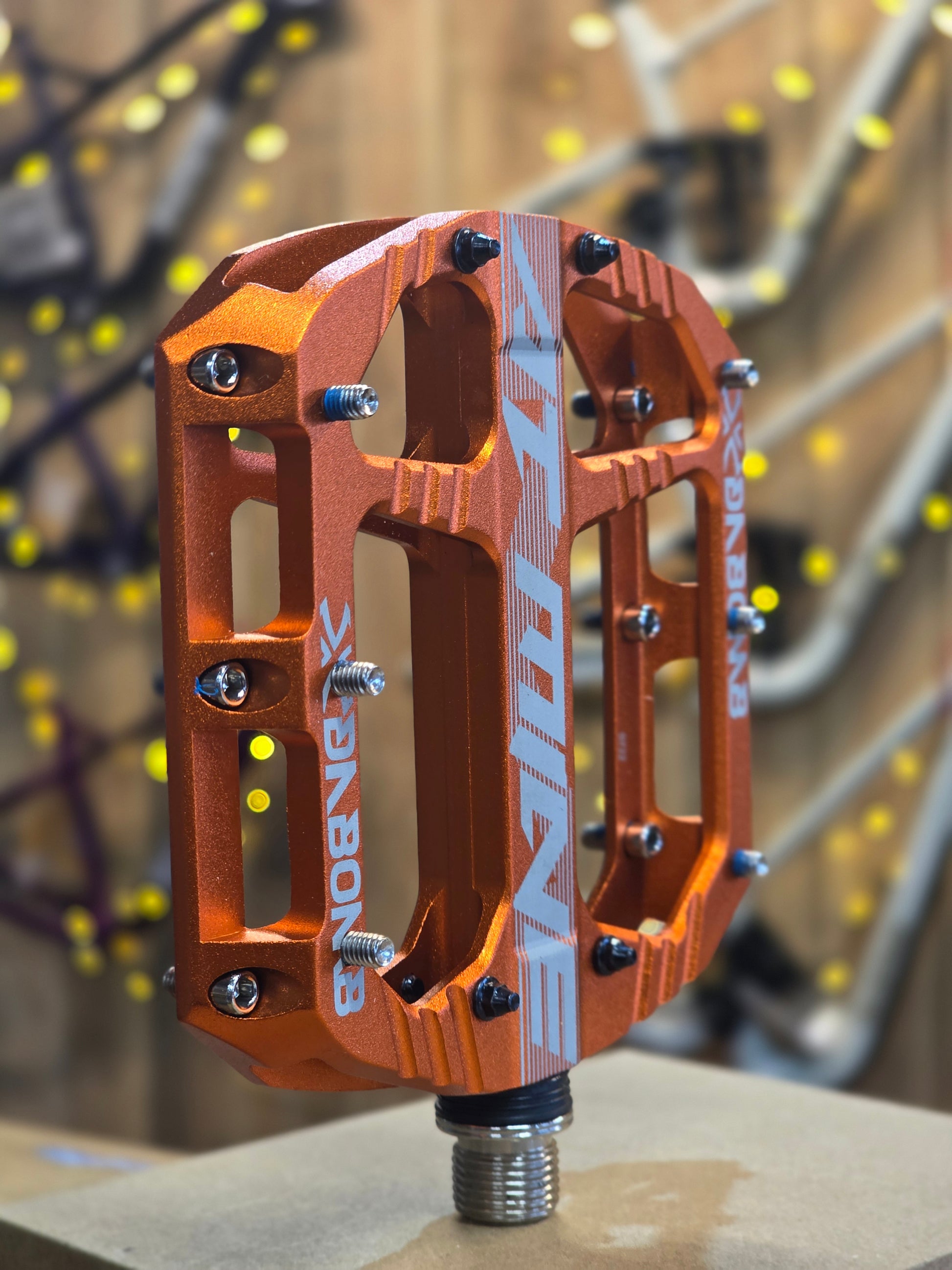 It's crafted from high-quality CNC-machined aluminium, featuring a distinctive cut-out design to minimize weight to under 400g per pair without sacrificing strength. The extra wide, 16mm-thick platform with a slightly concave surface provides excellent support and stability. Replaceable cylindrical pins offer superior traction and grip, reducing slip risk. Reliable and robust, it's perfect for demanding riders.